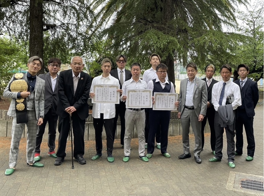 第一工事部、社員うち5名の母校である八尾市立八尾中学校門扉他塗装補修工事の寄贈、ハンドボールゴール寄贈感謝状贈呈式には社員一同、黒田斗真選手で出席
